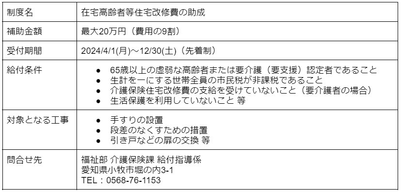 小牧市にある高齢者や障害者向け住宅改修を対象にした補助金制度は、以下の2つです。